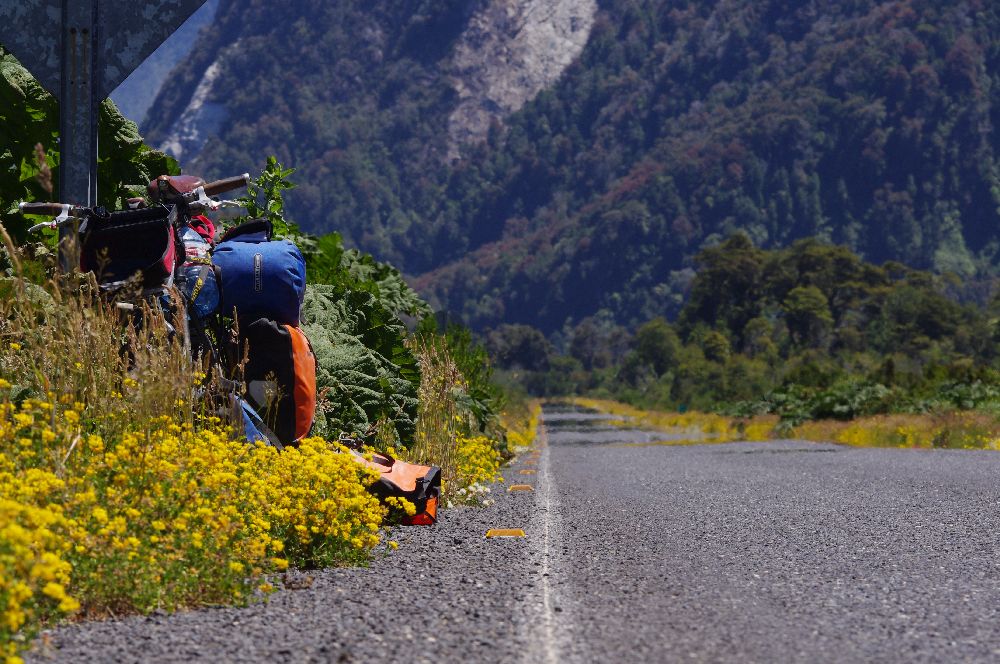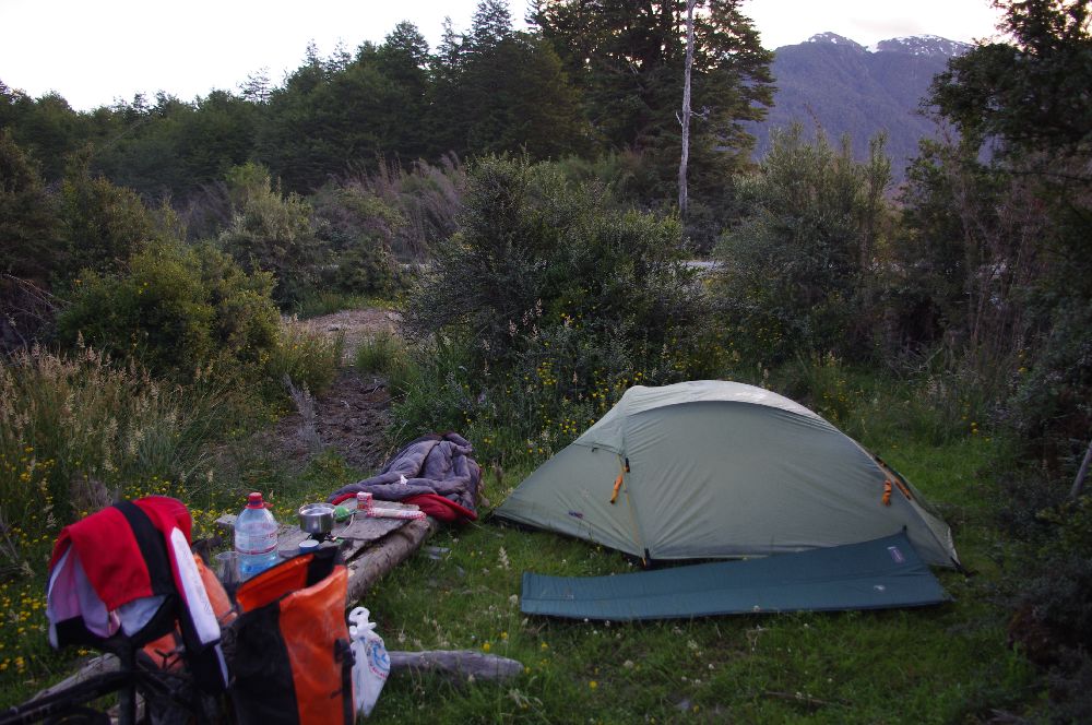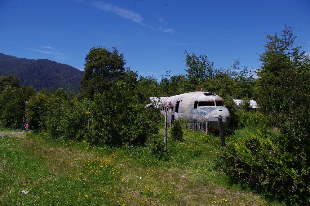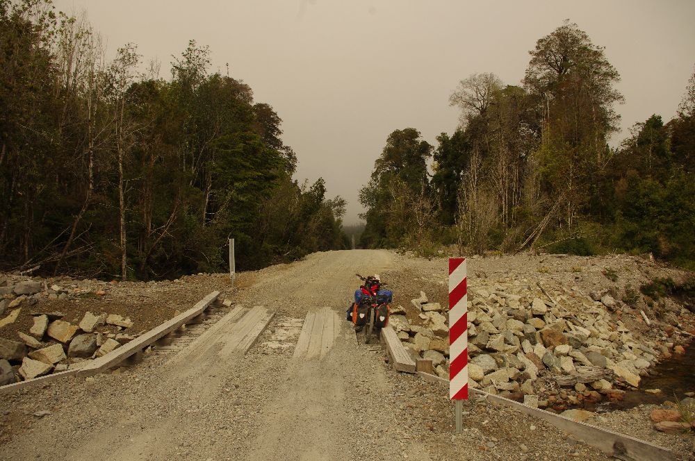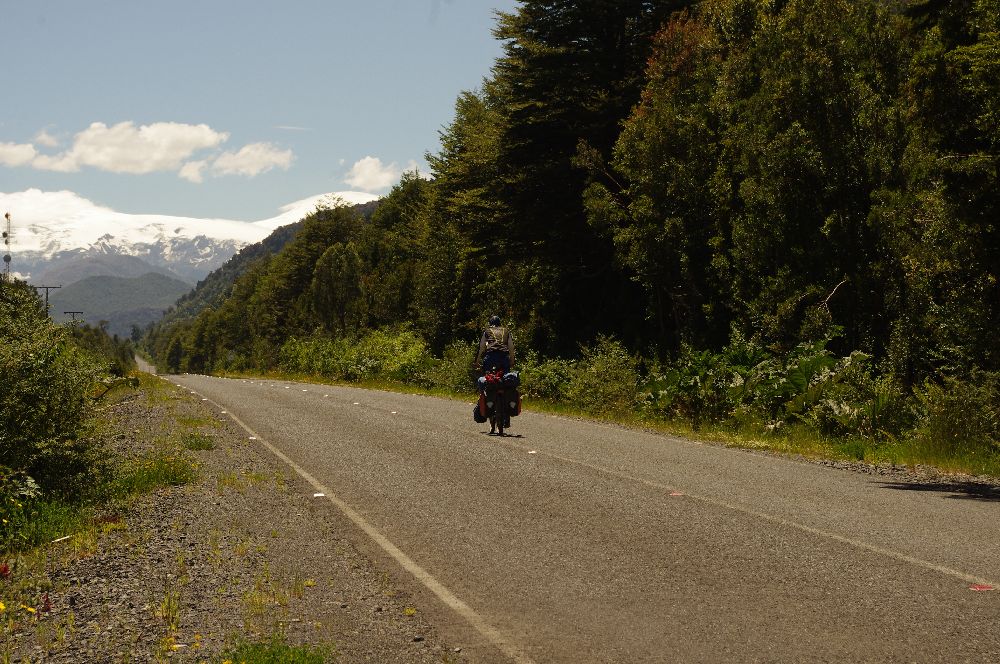 Im Staub sehe ich die frischen Spuren eines Radlers. Nach ein paar Stunden habe ich ihn eingeholt. Ein junger Bursche mit Anhänger, er ist von Santiago hier hergefahren, war nicht schön wegen des vielen Verkehrs meint er. Seine Ladung verrutscht ständig, seine Schaltung spinnt, viele Gänge hat er sowiso nicht. Deshalb kommt er nur schleppend voran, trotzdem fahren wir ein Stück gemeinsam. Über das Rollfeld des örtlichen Flughafens geht es schließlich nach Chaiten. Die 5000 Einwohner-Stadt wurde 2008 von einem Vulkan bzw dessen Schlammlawine ausradiert. Deshalb ist hier nicht mehr viel los. Die Strasse ist jedoch asphaltiert, es gibt einen Supermarkt und einige Leute sind dabei ihre Häuser wieder aufzubauen. In der Ferne raucht noch der Vulkan. Auf dem Teer mit Rückenwind hole ich den Chilenen wieder ein, er hat Chaiten schon gesehen und ist deshalb einfach durchgerauscht. Er will die wundervolle Natur nochmal genießen bevor durch “HydroAysen”, ein Staudamm der am Rio Baker im Süden errichtet werden soll alles kaputt gemacht wird. Rio Baker ist weit entfernt aber die Stromleitungen sollen durch das ganze Gebiet nach Norden führen, wo der Strom für die Kupferminen gebraucht wird. Das Projekt ist in Chile sehr umstritten und es gibt großen Widerstand in der Bevölkerung. das wird aber vermutlich nichts verhindern…