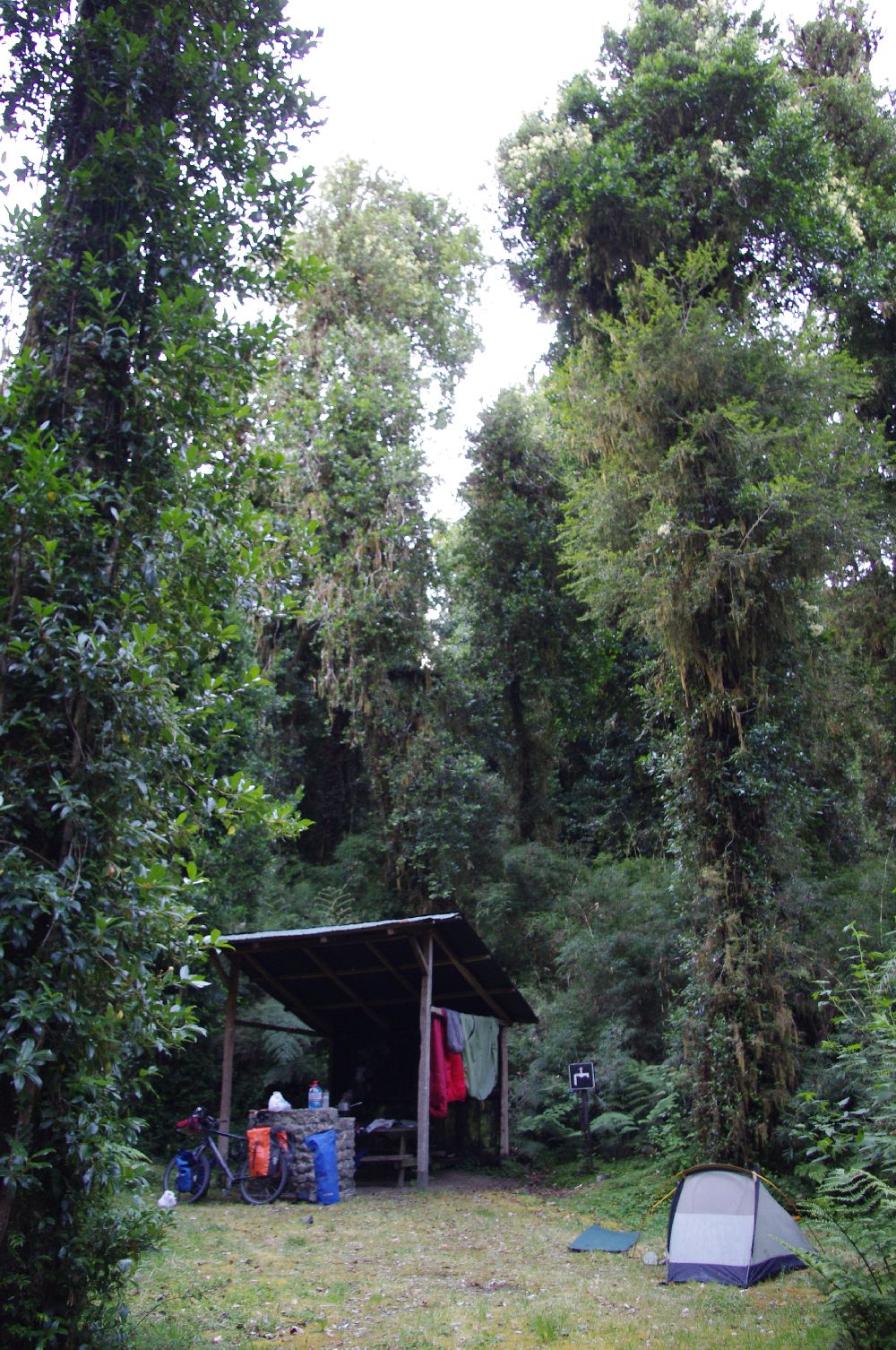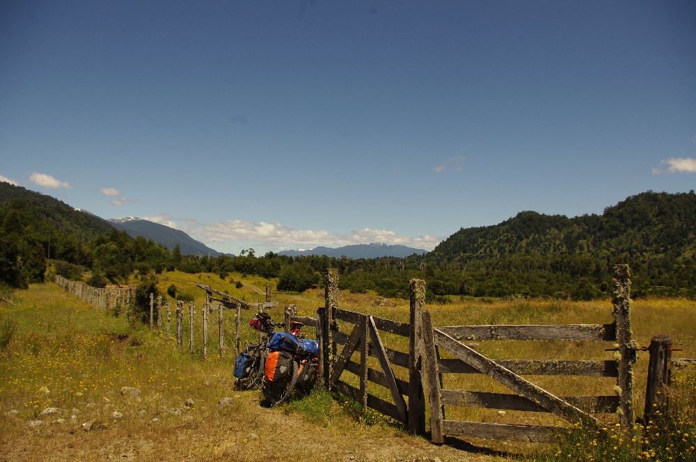 Morgens fallen ein paar Regentropfen – ich schlafe also etwas länger. Danach gehts am Fluss entlang, saftige Landschaft mit Regenbogen, super! In La Junta wollte ich einkaufen, ist aber Feiertag, 1.1.2012. Alles geschlossen, ca 10 Tramper versuchen Autos zu finden um den toten Ort zu verlassen, ich trete einfach in die Pedale. Später sehe ich das Auto meines Fahrers von der Fähre. Er hatte mich in sein Haus eingeladen, er wollte mich verköstigen und ich hätte da pennen können. Ist aber zu früh am Tag, außerdem ist Siesta-Zeit und niemand ums Haus, also fahre ich weiter. Gegen Abend sehe ich ein nobles Lodge-Areal an einem See. Vor jeder Hütte steht eine BMW 1200GS oder F800. Für verwahrloste Camper ist hier kein Platz. Nach weiteren 10 km finde ich einen wunderschönen kostenlosen Campingplatz mit warmer Dusche. Mein lauschiges Plätzchen ist von dichtem Urwald umgeben und mit einer Hütte und Feuerstelle sowie fließend Wasser ausgestattet. Ich laufe noch etwas umher und finde eine große Nalca-Pflanze am See. Kolibri und Mega-Hummel gehören schon zum Alltag, aber fotografieren lassen sie sich nicht.