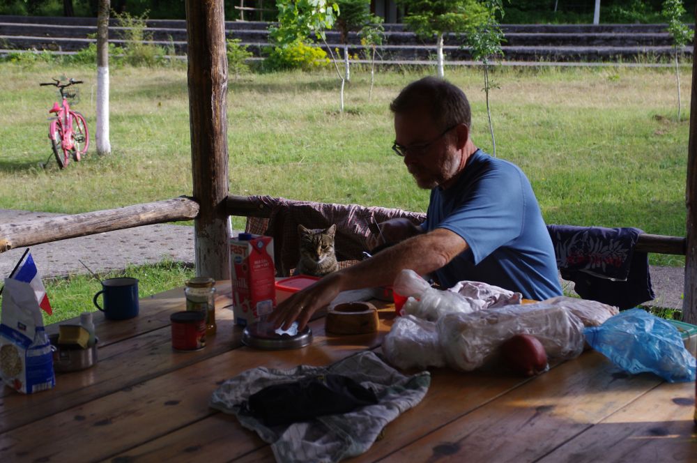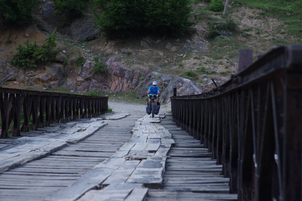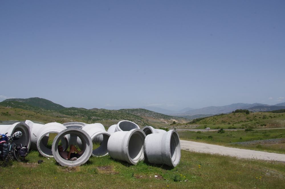 Sonntag erreichen wir Kukesh, wo wir ausgiebigst Mittag essen. Beim einkaufen bekommen wir die Zwiebel geschenkt. Die Leute schmunzeln immer etwas wenn wir nur eine Zwiebel kaufen. Jean nimmt oft noch einen bunten Lolli dazu. Danach müssen wir einen Berg erklimmen, den ich aus der Ferne scherzhaft als “small hill” tituliert hatte. Das sollte von nun an mein Spitzname sein, denn so klein war das Ding nicht… Danach gehts auf einer schmalen Schotterpiste über zahlreiche Kehren in ein tiefes Tal wo wir eine herrliche telle zum zelten finden. Sternenhimmel und Lagerfeuer, Glühwürmchen und Fluss.