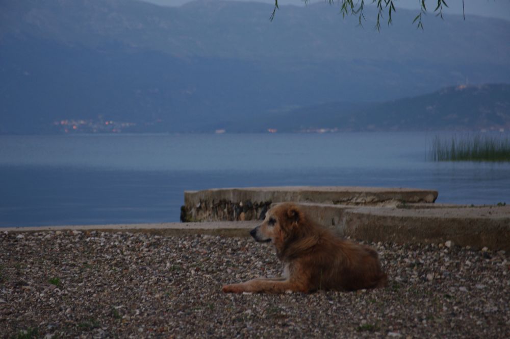 Dienstag werde ich wach als Jean wilde Hunde verscheucht, die allgegenwärtig aber immer harmlos sind. Wir fahren nach Struga, wo uns ein prächtiges Mittagessen zum Spottpreis erwartet. Die Blicke über den Ohrid See sind faszinierend, das kommt auf den Bildern nicht heraus. Abends übernachten wir auf der Wiese eines Hotels bei Pogradec für 2€ pro Nase und baden im See, danach erst sehen wir die Wasserschlangen, die sich tummeln.