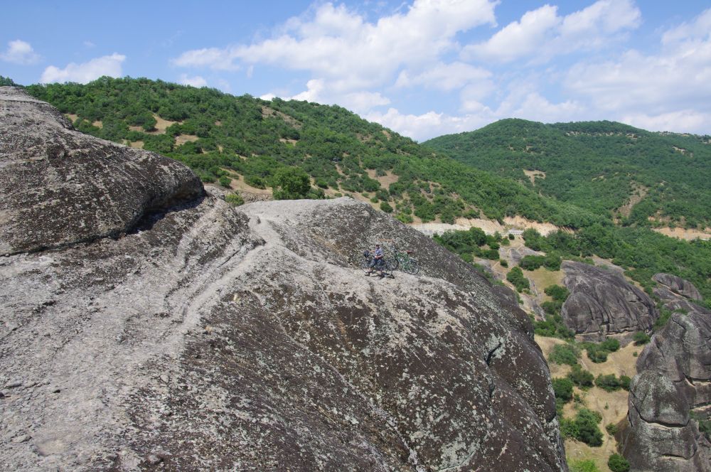 Zurück in der EU fühlen wir uns so unverletzbar, dass wir nichts einkaufen und eine Passstraße in die Berge wählen. 1000hm und einige Ortschaften später stellen wir fest, daß es nichts zu kaufen gibt hier oben. Wir erreichen schließlich ein Dorf mit einem Restaurant. Der Wirt ist untröstlich, daß er uns nicht anbieten kann, da gestern 10 Leute da waren die alles aufgegessen haben. Nach einigem Suchen findet er fettige Würste und Eier, die er uns zubereitet. Dazu gibts immerhin Wein. Die Zelte dürfen wir auf dem Spielplatz aufbauen, wo uns die Kinder noch zeigen wie sie an den Gerüsten klettern können. Nachts muss ich furchtbar schnell aus dem Zelt, ich schließe auf einen kausalen Zusammenhang mit der Wurst…