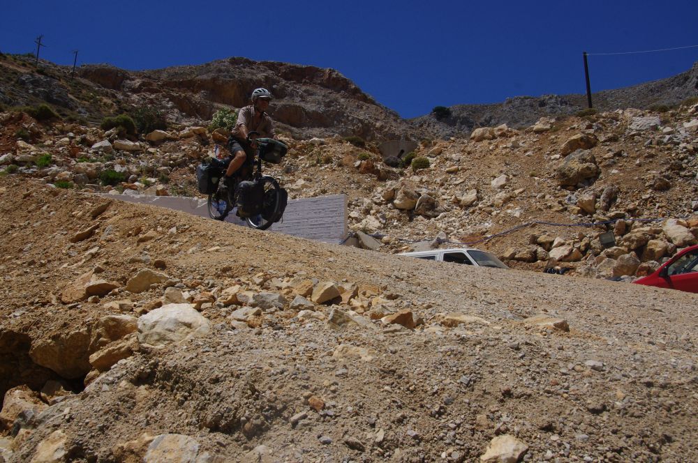 Freitag nach der höchsten Passüberquerung von 1750m ü.d.M. erreichen wir Grevena und suchen uns danach eine Stelle in einem breiten Flussbett. Jean wählt eine etwas tiefere Stelle und prompt werden wir von einem Platzregen überrascht, die erste Hälfte der nacht packt er weder Matraze noch Schlafsack aus um sie trocken zu halten.