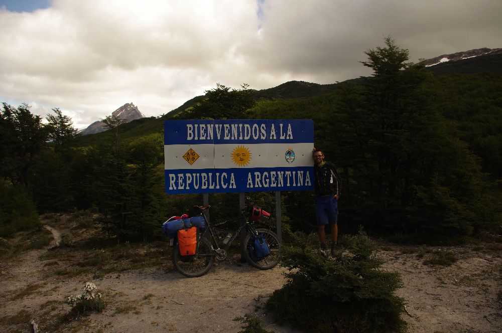 Am 14. müssen wir früh aufstehen. Die Fähre geht um 8:30Uhr und bis zum Hafen sind es noch 7km. Rechtzeitig terffen wir dort ein, auch Tanguy hat noch ein Ticket bekommen. Alle Taschen müssen vom Rad, sie werden im Bootsinneren verstaut. Die Räder werden sehr sorgfältig an der Reeling vertäut. Wir wundern uns, denn der See ist sehr ruhig, kaum Wind. Als die etwa 60 Leute an Bord sind legen wir ab. Viele der Fahrgäste sind Rentner, mit dem Bus angereist. Sie wollen den Gletscher sehen, wir steigen früher aus. Unter den 8 Radlern sind 3 Österreicher, zwischen 65 und 73 Jahren alt. Mit grossem Respekt wird über sie gesprochen. Die restlichen sind Katalane George und Mascha aus der Ukraine, Scott, Tanguy und ich. Die Überfahrt dauert etwa 3 Std. davon ist eine Stunde sehr stürmisch und 2-3m hohe Wellen lassen einen den festen Blickkontakt zum Ufer suchen. In Candelario Macilla werden unsere Packtaschen wieder hervorgeholt und die Fahrräder beladen. Es geht steil bergauf, nach einigen 100 Metern kommt die chilenische Grenzstation. Alle haben ihren 90-Tage-Zettel noch und kommen problemlos raus. Danach müssen wir bestimmt 400hm auf gröbstem Schotter und bei starkem Seitenwind überwinden. Etwa 20 km lassen sich gut fahren, dann kommt die eigentliche Grenze nach Argentinien. Danach wird die schlechte Schotterstraße zum Waldtrail, immer wieder müssen wir über Baumstämme Flüsse queren und steile Passagen mit heftigen Stufen hochschieben. Scott, Tanguy und ich bilden die erste Truppe, die anderen sind wiet hintendran. Wir helfen uns gegenseitig. Wir wissen, daß die älteren Leute aus Österreich sich das Gepäck von Pferden transportieren lassen, darum ist es nicht notwendig, ihnen hier zu helfen. Am Ende wird der trail so schmal und tief, daß die vorderen Packtaschen hängen bleiben. Alles sehr anstrengend, aber wir haben die “gute Richtung”. Die schwersten Passagen gehen bergab. Am Lago Desierto angekommen gibts den Einreisestempel nach Argentinien, kurz darauf um 18:00Uhr kommt das Boot über den See. Nach 45min. sind wir am südlichen Ende des Sees , bis El Chalten wären es etw 40km. Scott will gleich auf dem Campingplatz übernachten, Tanguy möchte noch 20 km fahren und dann irgendwo übernachten. Ich möchte nur ein Stückchen fahren und mir ein Plätzchen am Bach suchen, habe kein argentinisches Geld und brauche keinen Campingplatz. So trennen wir uns wieder.